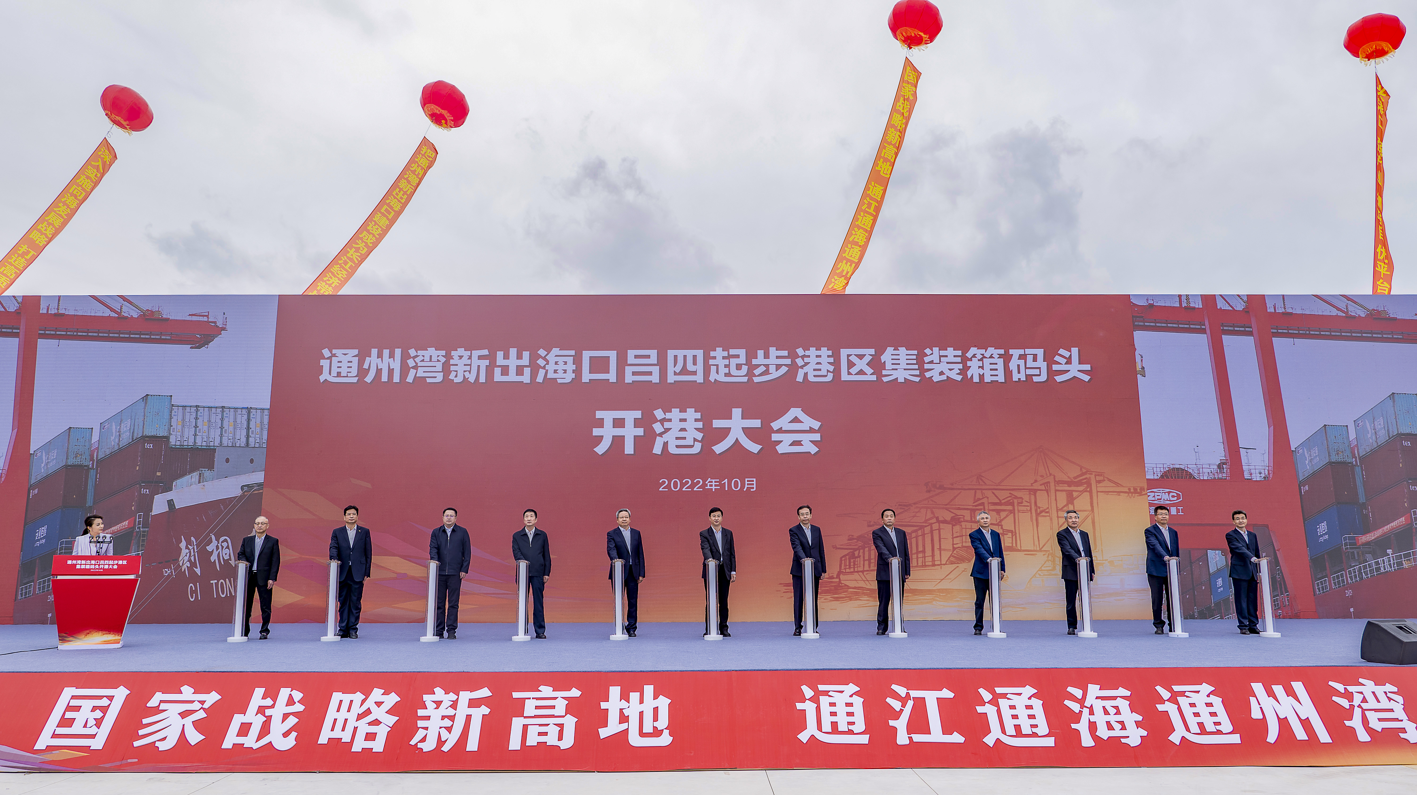 通州灣新出??趨嗡钠鸩礁蹍^是建設“一帶一路”對外開放新門戶、長江經濟帶江海聯運新樞紐、江蘇沿海高質量發展新樣板的重大標志性工程。本次開港的起步港區8#-9#泊位是南通港首批建成的兩座10萬噸級現代化集裝箱碼頭,也是全省首個采用5G新技術實現港區全自動化作業的集裝箱港區,設計年通過能力140萬標箱。碼頭的建成開港,標志著南通港集裝箱運輸事業迎來了由江及海的歷史性飛躍。開港后,碼頭將由上港集團、省港口集團和南通港口集團合資組建的江蘇滬通集裝箱碼頭有限公司負責運營,助力南通加快建設上海國際航運中心北翼江海組合強港。