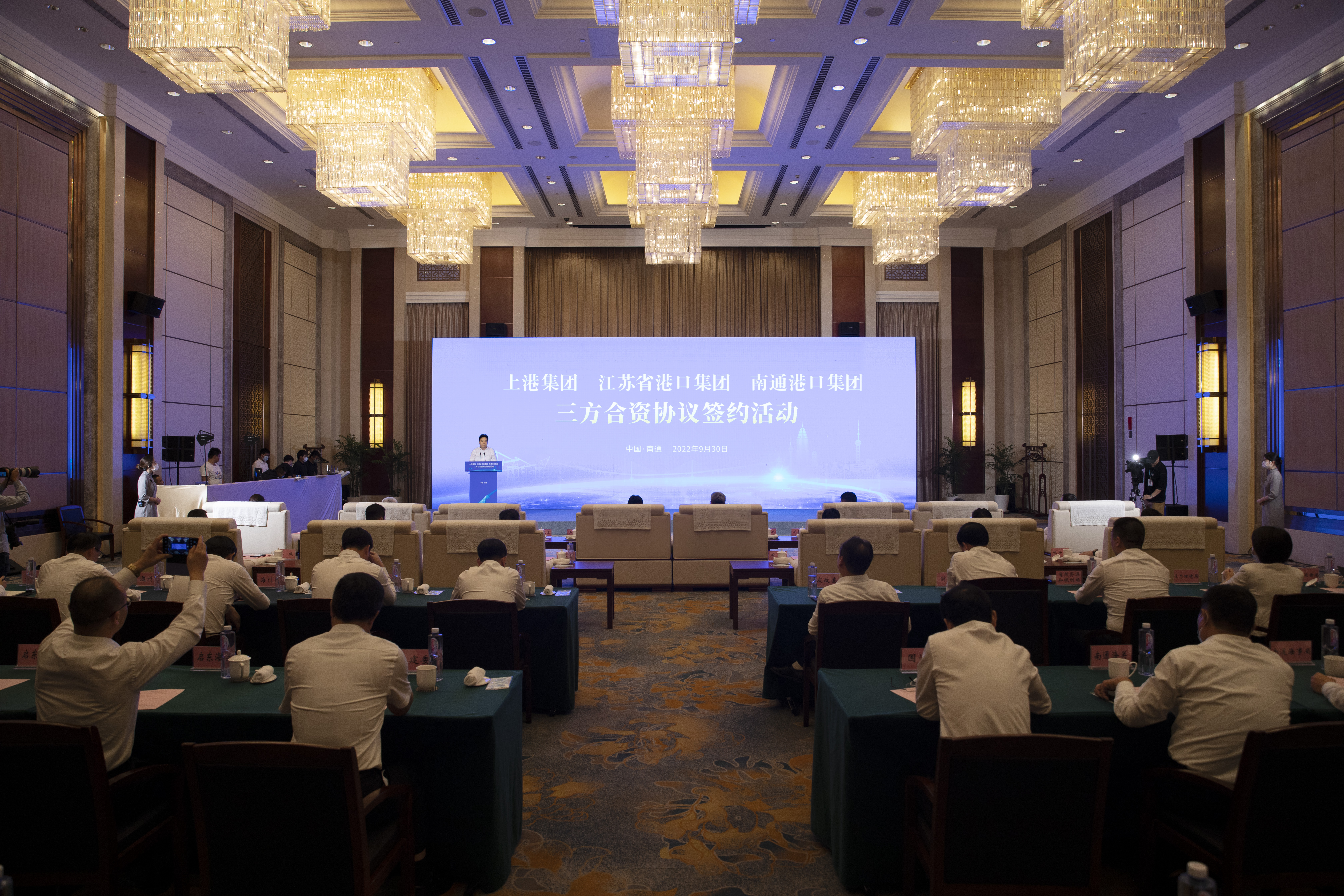 四時俱可喜,最佳新秋節。在金秋送爽、喜迎豐收的美好時節,9月30日上午,上海國際港務集團、江蘇省港口集團、南通港口集團在濱江會議中心簽署協議,三方將組建合資公司,攜手運營呂四起步港區集裝箱碼頭。上港集團黨委副書記、總裁嚴俊,省港口集團黨委副書記、總經理關永健,市委副書記、市長吳新明致辭并見簽。市委常委、常務副市長陸衛東主持簽約活動。
